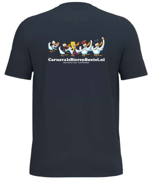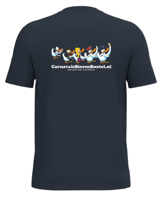 Shirt voorzien van een klein borstlogo van het “Cool Rooster” of “IndeGat” en een ruglogo van “CarnavalsBierenBoxtel.nl”